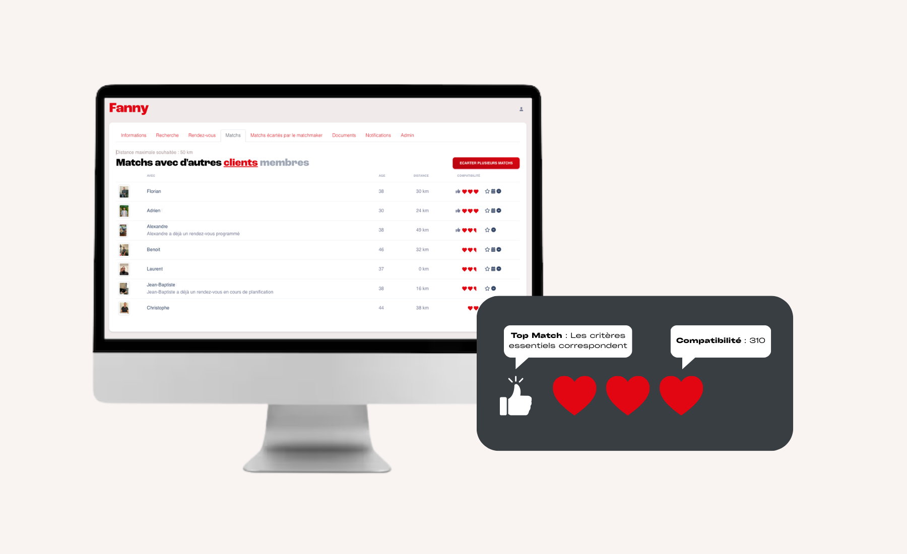 - Score de compatibilité, basé sur les questionnaires clients